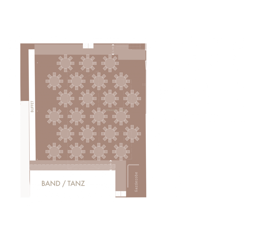 Die direkte Verbindung zum Außenbereich Nord und dem Biergarten bietet eine Vielzahl von Möglichkeiten – laden Sie zum Empfang unter die Platanen des Biergartens oder nutzen Sie den Außenbereich Nord exklusiv für Ihre Veranstaltung.